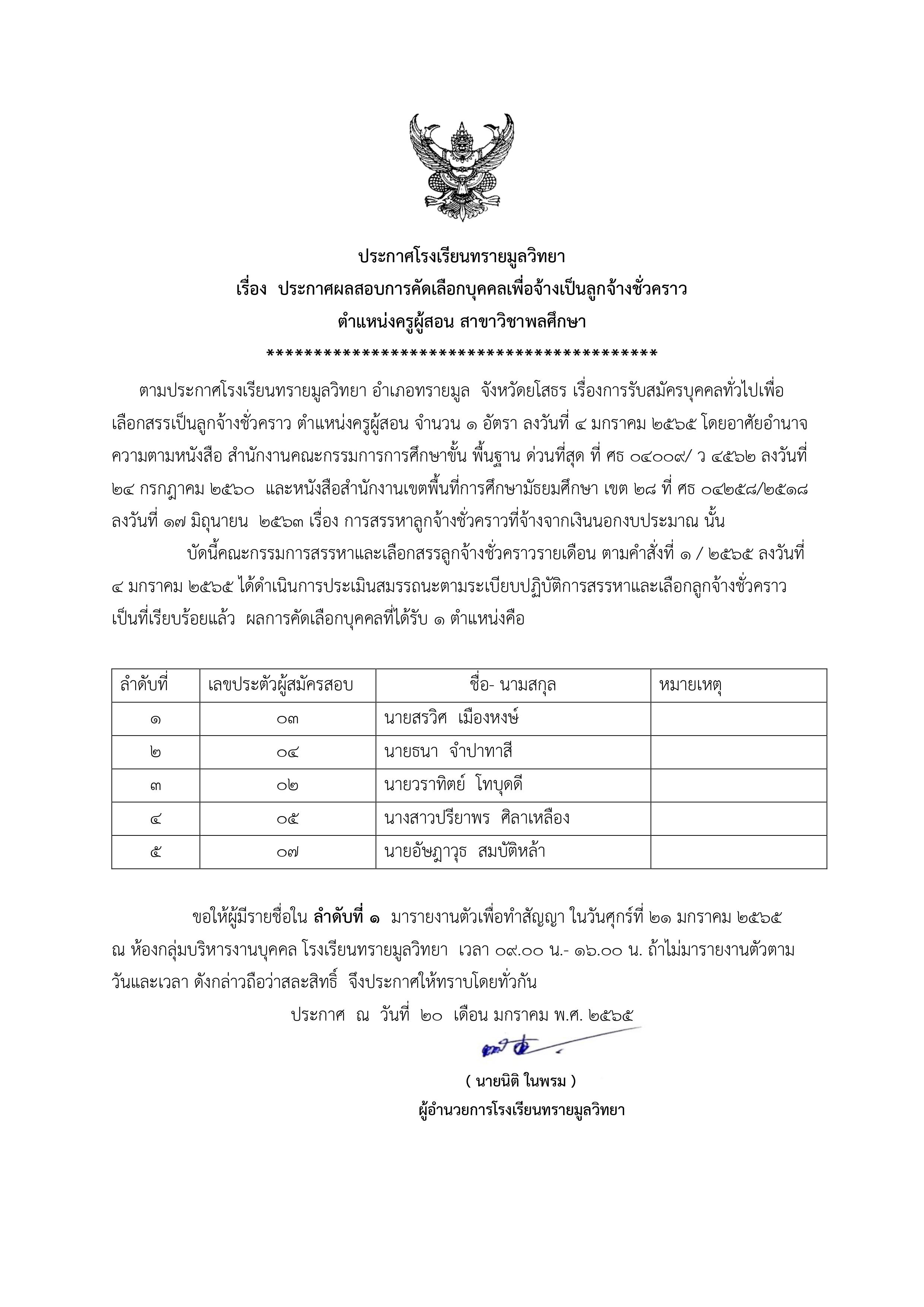 ประกาศโรงเรียนทรายมูลวิทยา เรื่อง ประกาศผลสอบการคัดเลือกบุคคลเพื่อจ้างเป็นลูกจ้างชั่วคราว ตำแหน่งครูผู้สอน สาขาวิชาพลศึกษา