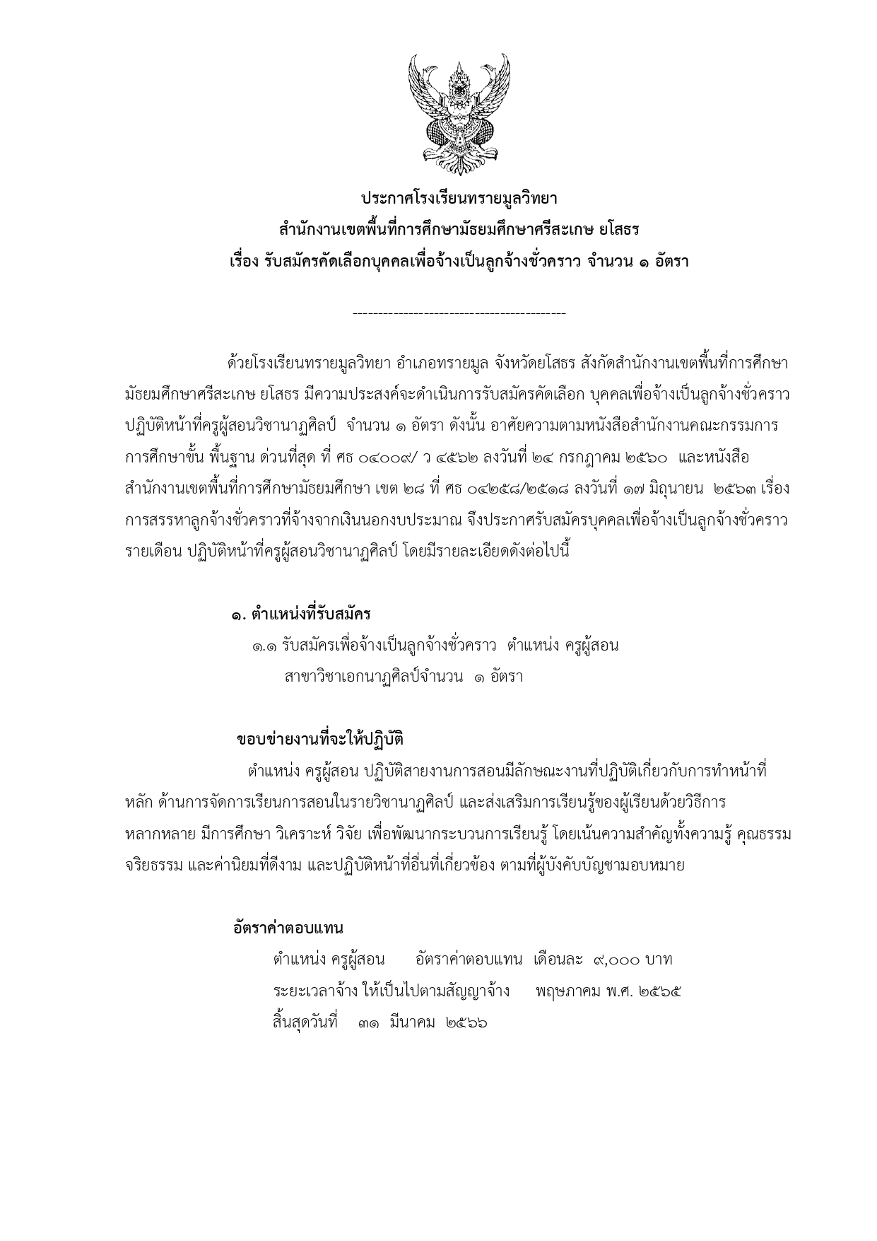 ประกาศโรงเรียนทรายมูลวิทยา เรื่อง รับสมัครคัดเลือกบุคคลเพื่อจ้างเป็นลูกจ้างชั่วคราว จำนวน 1 อัตรา