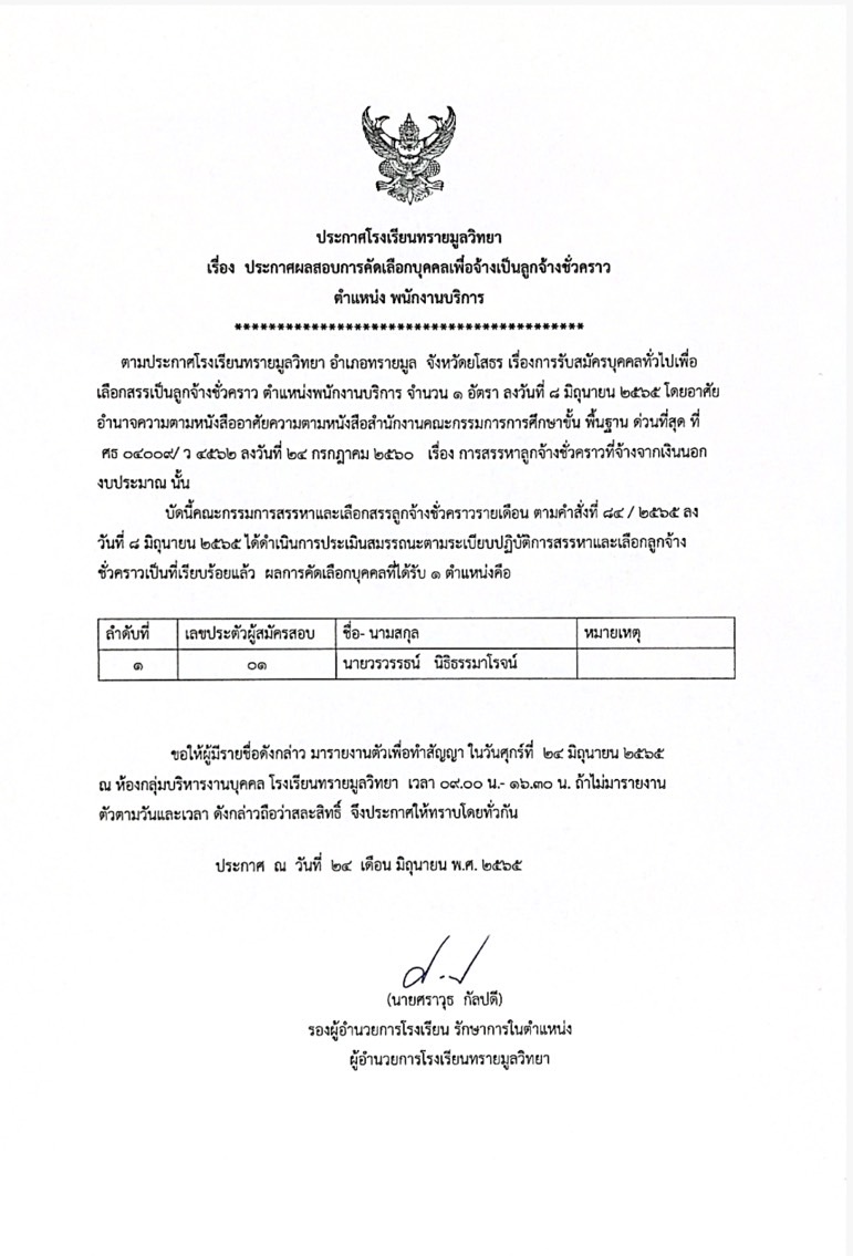 ประกาศผลการสอบคัดเลือกบุคคลเพื่อจ้างเป็นลูกจ้างชั่วคราว ตำแหน่งพนักงานบริการ