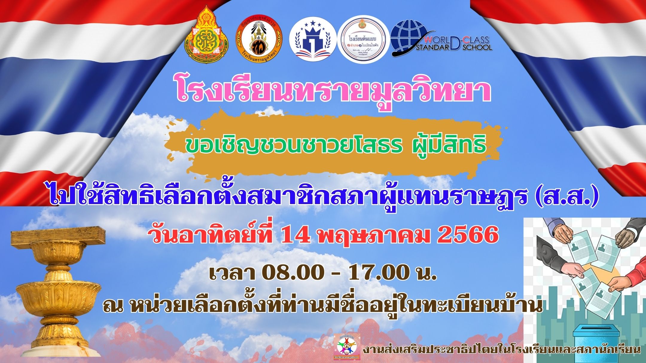 โรงเรียนทรายมูลวิทยา เชิญชวนชาวจังหวัดยโสธร ผู้มีสิทธิไปใช้สิทธิเลือกตั้งสมาชิกสภาผู้แทนราษฎร (ส.ส.)