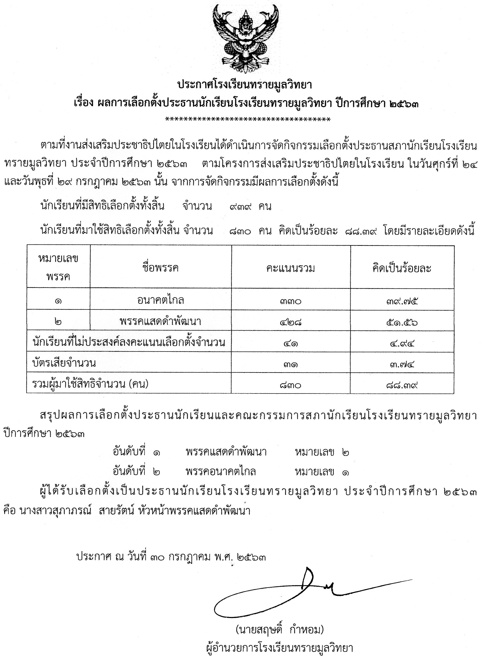 ประกาศโรงเรียนทรายมูลวิทยา เรื่อง ผลการเลือกตั้งประธานนักเรียนโรงเรียนทรายมูลวิทยา ปีการศึกษา ๒๕๖๓